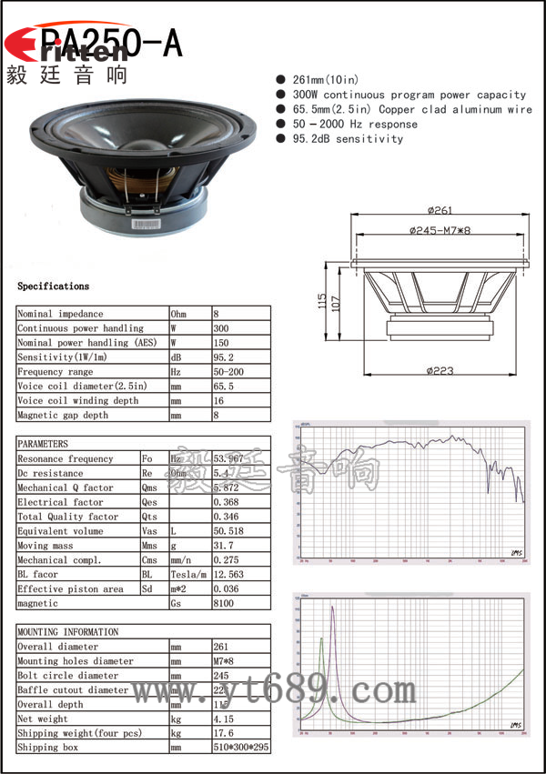 此款超級重低音揚聲器,廣泛用于10寸重低音舞臺音箱喇叭,額定功率達到150W,防水防潮喇叭,聽感厚實,受到廣大客戶的信賴。 |