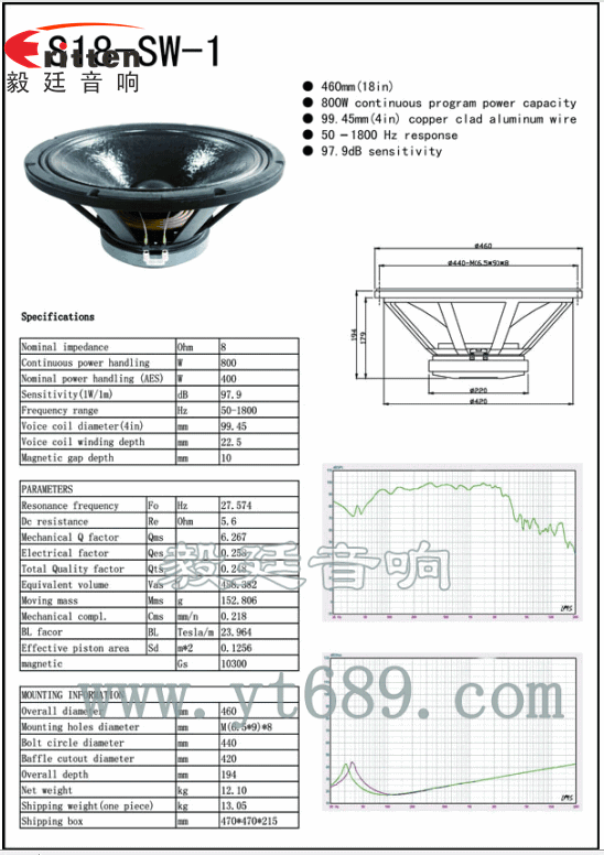 東莞市毅廷音響嚴格貫徹,質量讓您放心,服務讓您舒心,價格讓您動心,此款18寸專業舞臺音箱喇叭的額定功率為400W,最大峰值800W,音域28Hz~3KHz,音色清晰、自然。 |